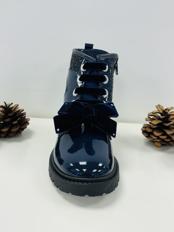 Andanines Navy Lace Up Velvet Bow Patent Boots